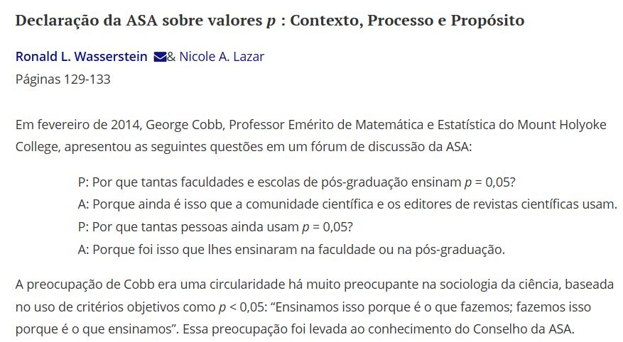 A própria ASA (Wasserstein;Lazar, 2016) e vários autores influentes (Amrhein, Greenland;McShane, 2019) recomendam abandonar a interpretação rígida baseada em p < 0.05. Entre os motivos: