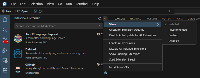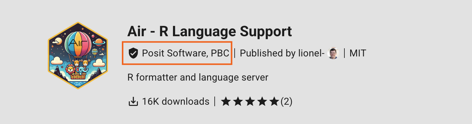 A extensão Air da Posit exibe o selo de Editor Verificado “Posit Software, PBC” e “lionel-”, o desenvolvedor da Posit que publicou a extensão.