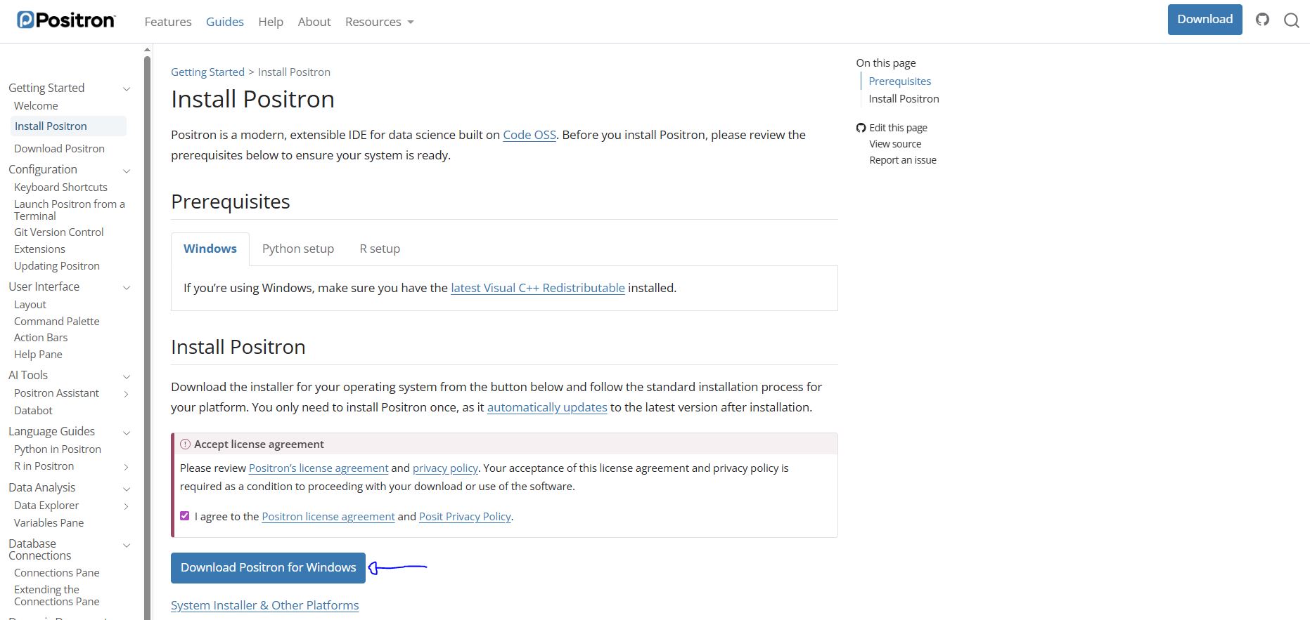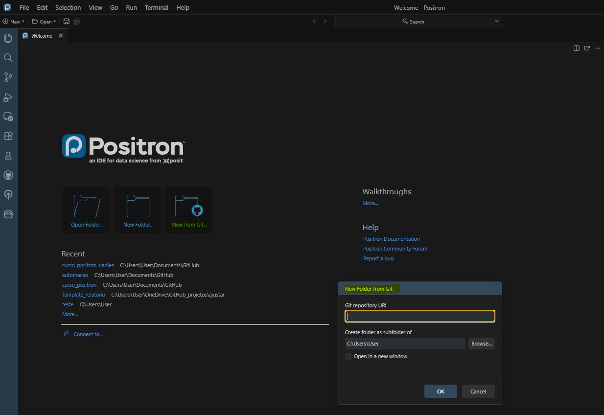 R 4.2 ou superior instalado. Instruções para seu sistema operacional.Se você usa Windows, observe que o Positron não inclui o Rtools atualmente .