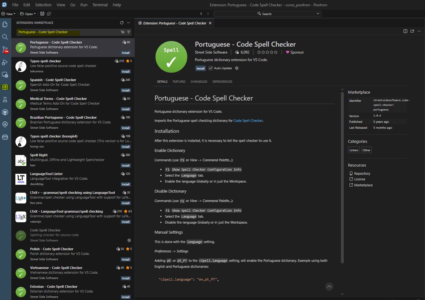 Como o Positron é baseado no Code OSS (o núcleo de código aberto do VS Code), você pode usar extensões do VS Code no Positron. As extensões instaladas para o Positron são independentes das extensões instaladas para o VS Code e não interferem umas nas outras.