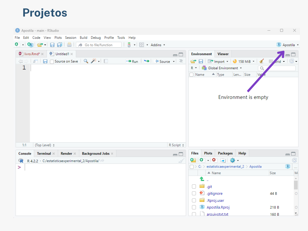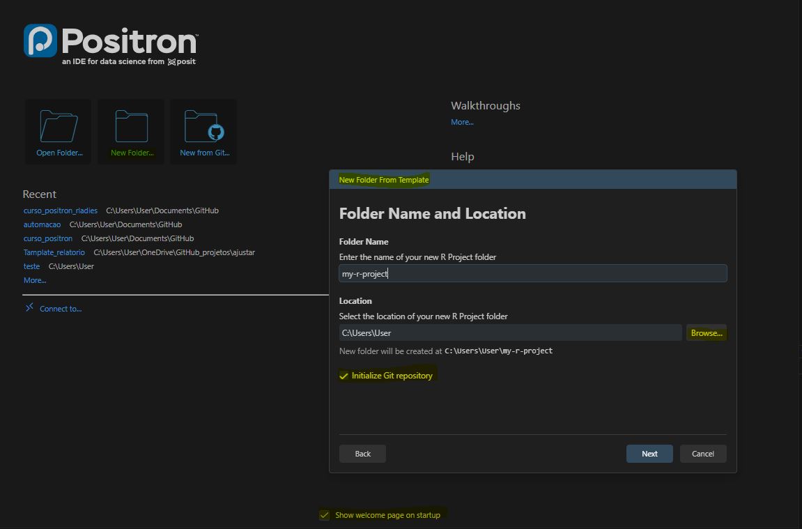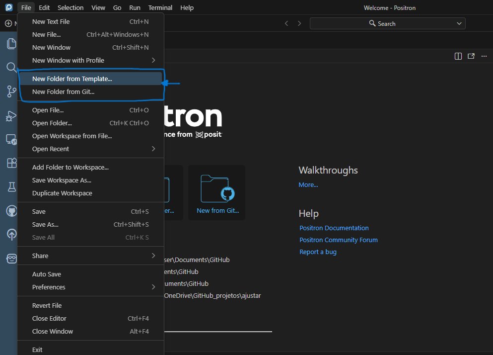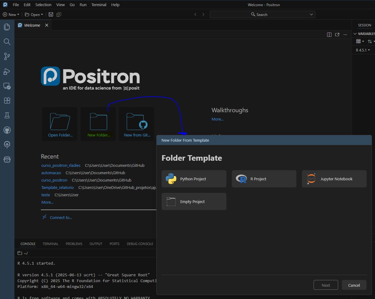 No VS Code e, portanto, no Positron, as palavras “pasta”, “espaço de trabalho” e “projeto” são usadas quase como sinônimos, pois a forma mais comum de trabalhar é em um espaço de trabalho de pasta única.